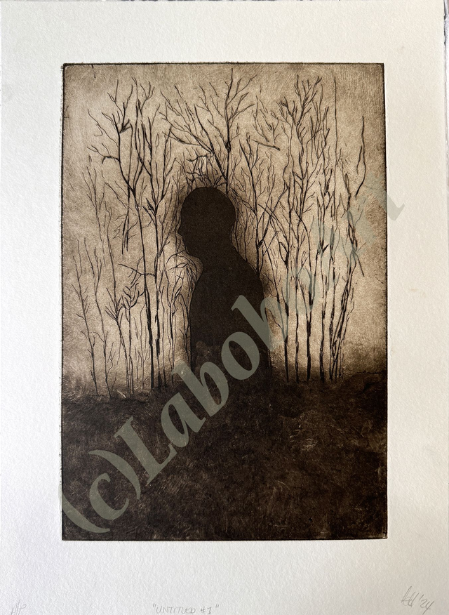 Artists Proof, original aquatint and soap ground etching in raw umber of man in woods.